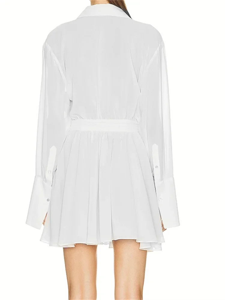 Women’s Summer Shirt Dress Solid Color Long Sleeve Turn-Down Collar A-line Casual Mini Pleated Waist Dress