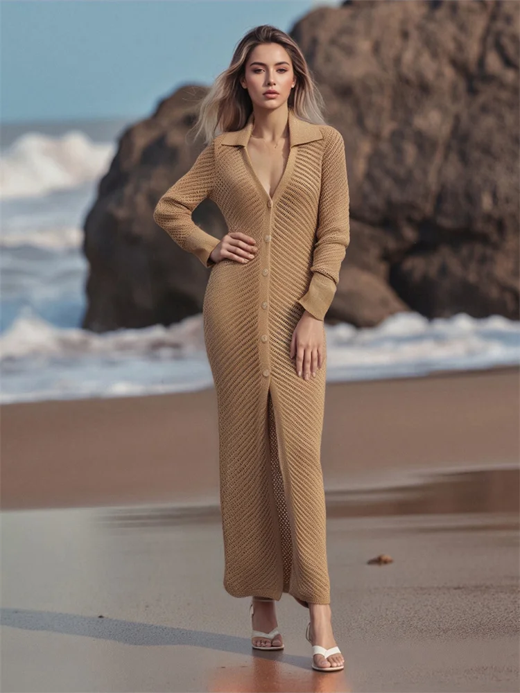 Women’s Long Knit Cardigan Stylish Hollow Details Button Down Lapel V Neck Long Sleeve Sweater Jacket for Fall/Winter